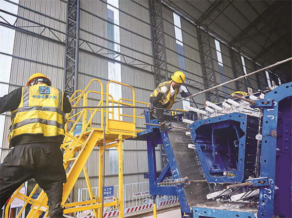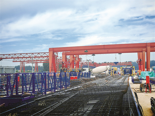 在该工程的综合场站,工作人员正在进行桥梁板材的预制。和以往的生产不同,产线上新增了许多“大房子”智慧蒸养室。传统模式的覆盖洒水养护,生产一片梁板需要7至8天,增加蒸养室后,在其停留50余小时便能成功生产一片梁板,效率提升近50%。此外,该工程基于数字孪生技术,实现生产全流程数字化管控,每道工序数据实时上传至智慧管理平台;运用AI视频分析技术,自动识别保护层厚度等关键指标,缺陷检出率超95%,减少人工巡查成本40%。