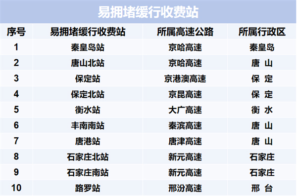 研判京哈、京沪、京台等10条高速公路的14个路段易发生拥堵缓行;秦皇岛、唐山北、保定等10个收费站易发生拥堵缓,涉及京哈、京港澳、京昆等8条高速公路;山海关服务区、沧州服务区、柏乡服务区等10个服务区较为繁忙,涉及京哈、京台、京港澳、大广4条高速公路。