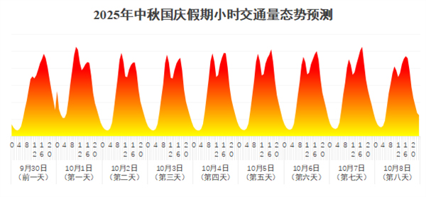 预计中秋国庆假期每日24小时交通量大体呈“M”型分布,每天上下午各出现一个高峰。9月30日(假期前一天)15时-20时流量出现增长;1日(假期第一天)迎来中秋国庆大流量,上午流量略高于下午;2日至4日车流高位运行较为平稳;5日(中秋节前一天)迎来第二波大流量;6日(中秋节)流量持续高位;7日、8日为返程高峰,下午流量将明显高于上午。